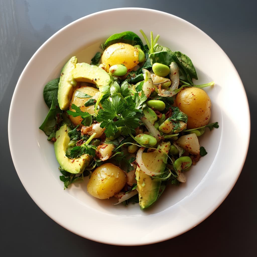 Meng aardappel, sojabonen, avocado en olijven in een kom.