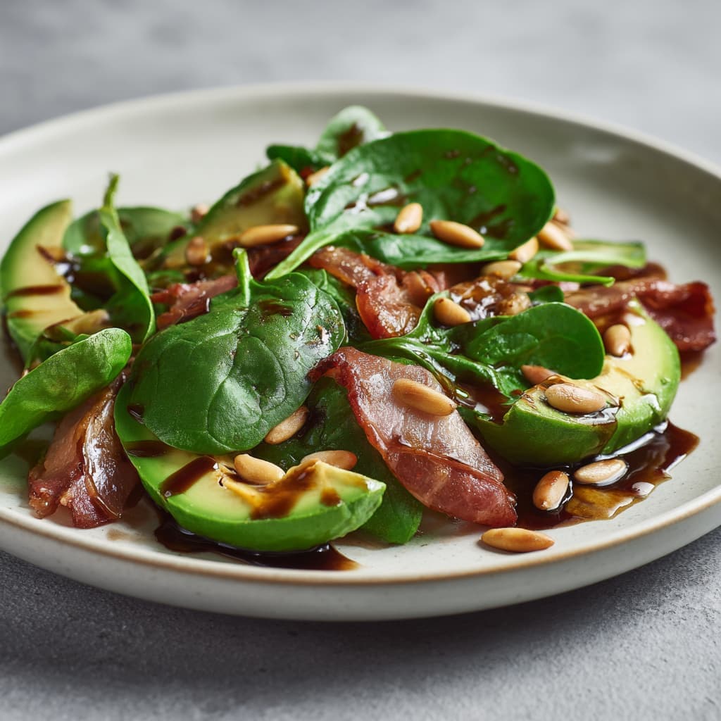 Een volle, warme salade waarin romige avocado, knapperige pancetta en zachte spinazie elkaar perfect aanvullen. Zout, friszuur en nootachtig in balans, precies zoals je hem wilt serveren aan tafel. Serveer deze salade direct, zodat de pancetta warm en knapperig contrasteert met de romige avocado.