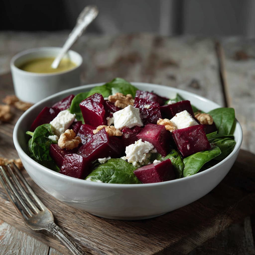 Deze bietensalade met geitenkaas en spinazie is precies zo’n lunch die moeiteloos in je dag past: fris, kleurrijk en in tien minuten klaar. De combinatie van zachte biet, frisse peer, romige geitenkaas en knapperige walnoten maakt het een lichte maar rijke salade waar je gemakkelijk meerdere dagen van kunt genieten. Serveer de salade direct met een beetje extra citroen voor frisheid.