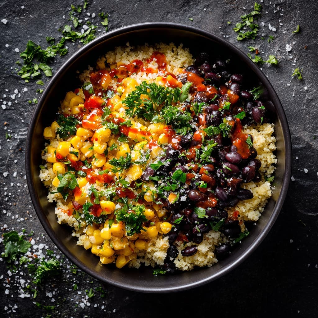 Bloemkoolrijstbowl met Zwarte Bonen, Chili en Geroosterde Mais