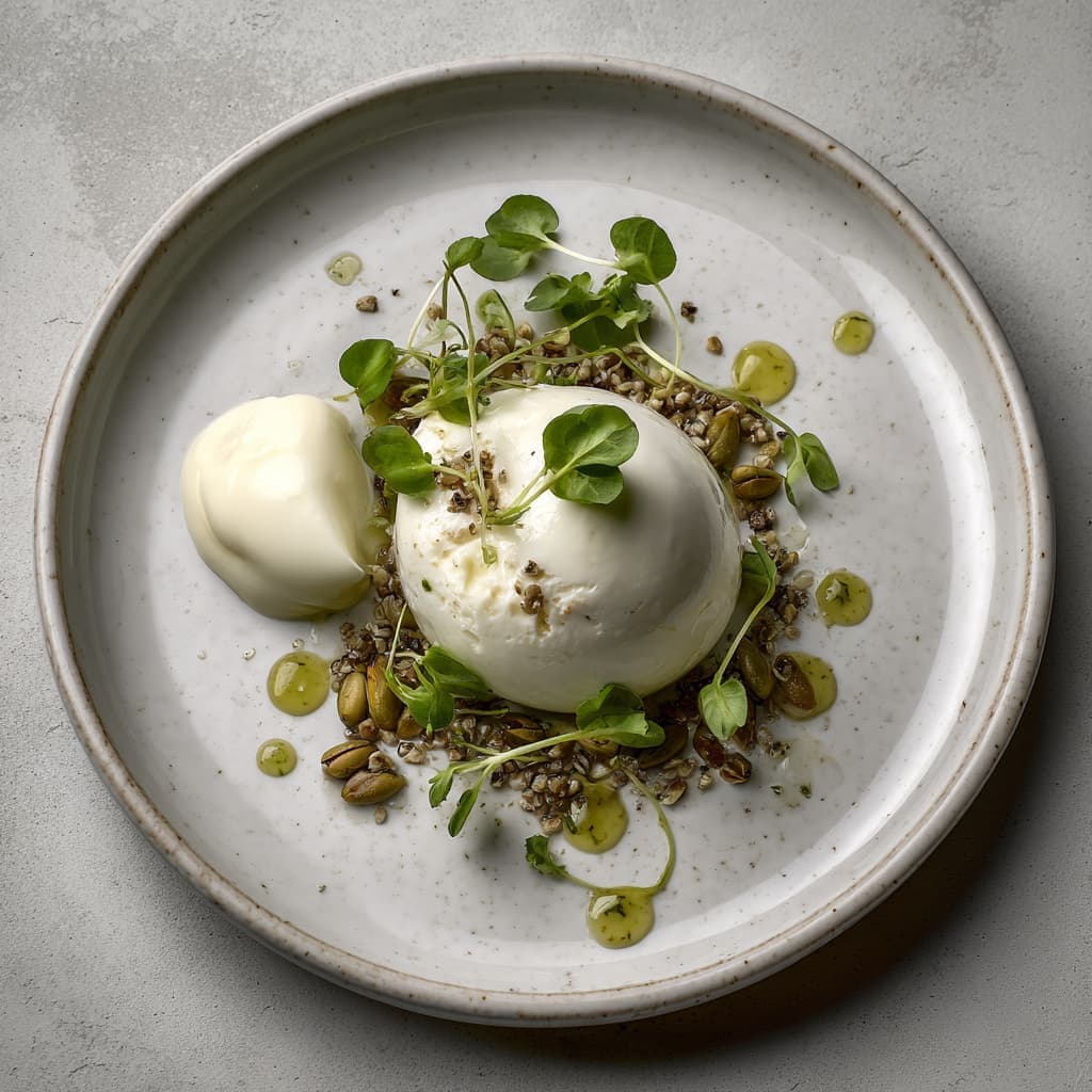 Mix Stracciatella di Burrata met een beetje yoghurt tot een zachte, romige mousse.