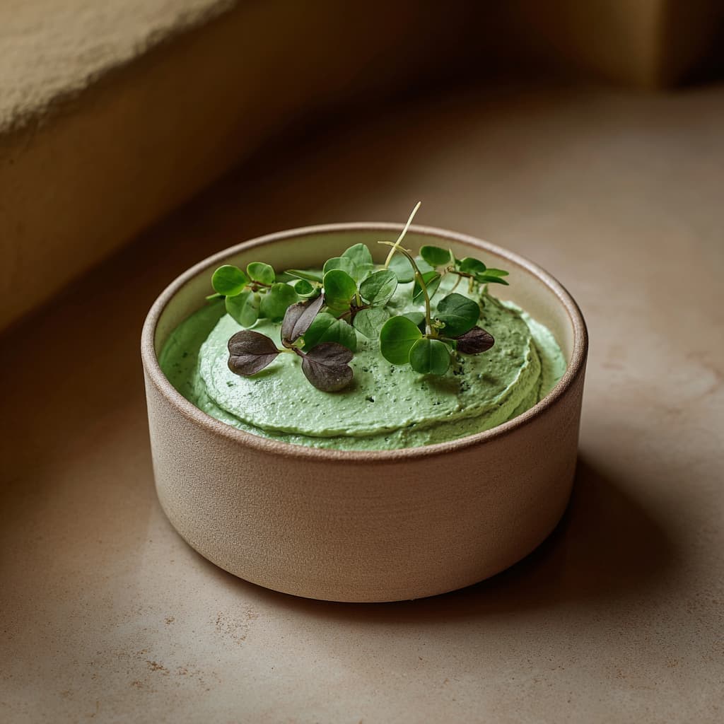 Delicious as a dip or a refreshing topping for vegetables, fish, or wraps. A fresh, soft basil cream with yogurt and herbs — light, pure, and perfect as a topping or dip.