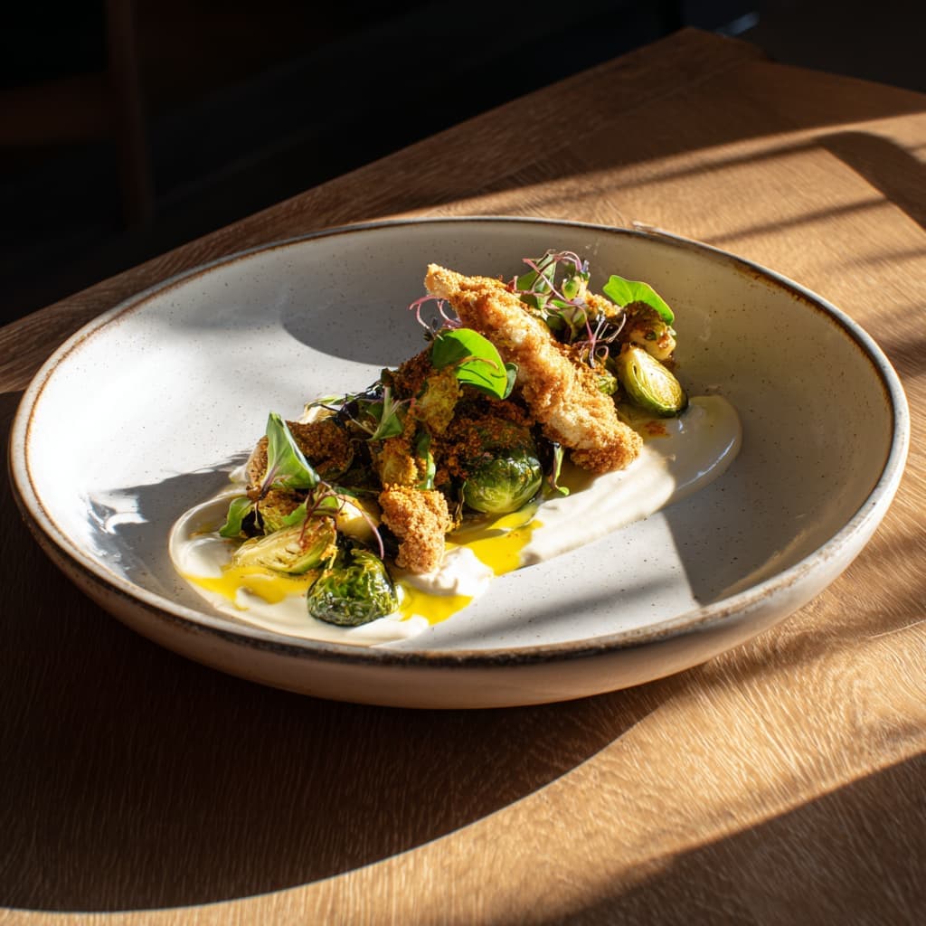 Brussels Sprouts with Lemon-Yogurt and Crispy Chicken Strips