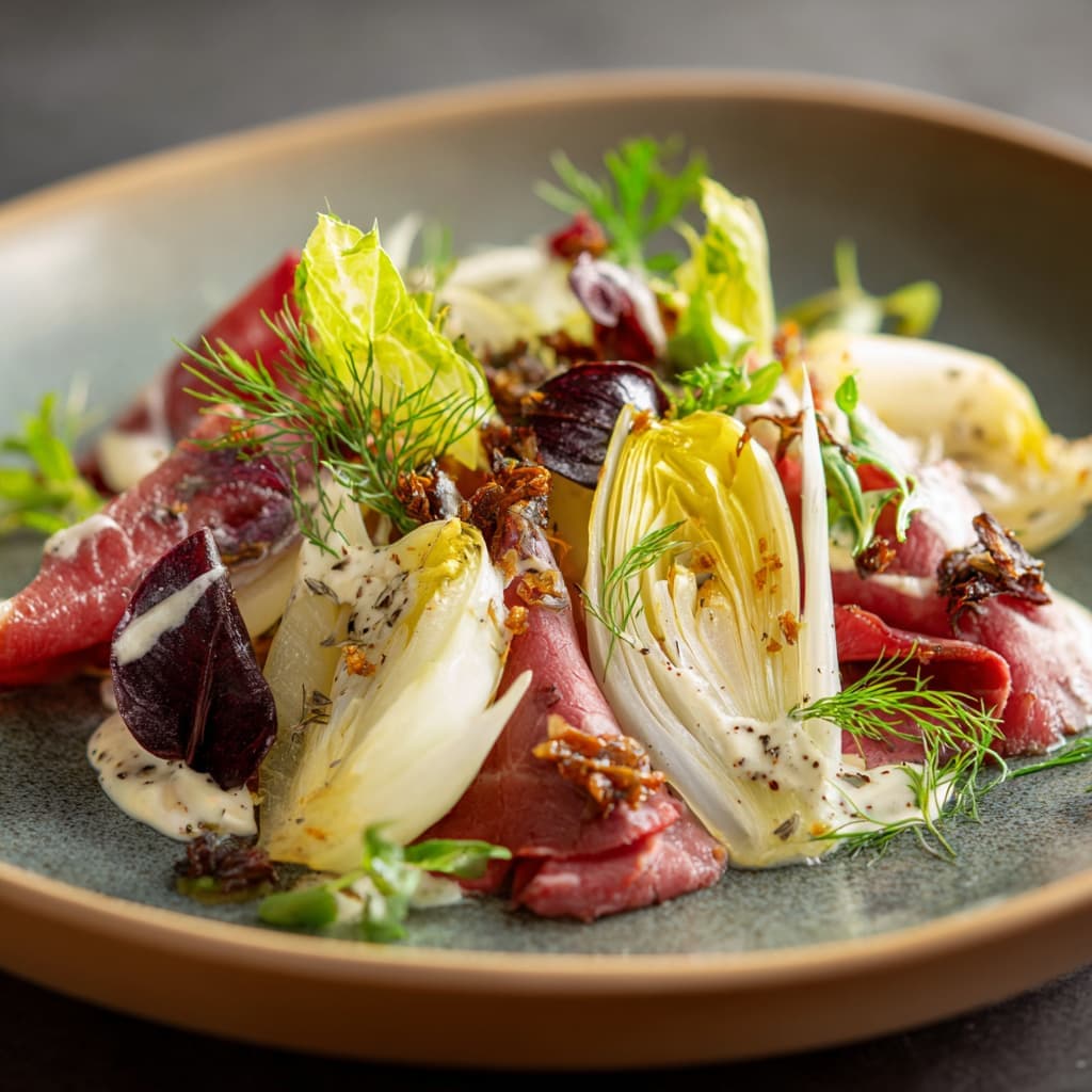 Combine the chicory, fennel, apple, and radishes with the dressing. Arrange on a plate, roll up the roast beef slices, and distribute them over the salad. Garnish with fennel fronds.