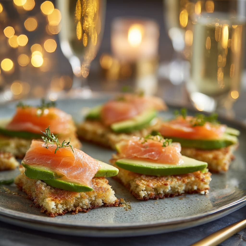 Place the salmon and avocado on each crispy cube. Serve immediately as festive New Year's Eve bites.