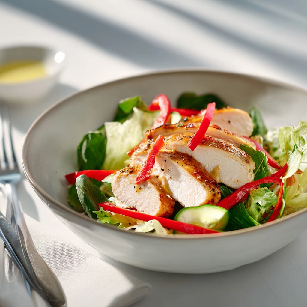 Serve the salad immediately with the warm chicken on top to highlight the contrast between cool and warm.