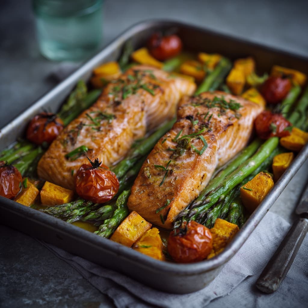 This oven-baked salmon is a relaxed traybake where everything cooks together into a warm, colorful, and flavorful dish. With sweet potato, green vegetables, and fresh herbs, you’ll have a complete meal on the table with minimal effort. Serve this traybake straight from the baking dish while the salmon is still juicy and the vegetables are warm and roasted.