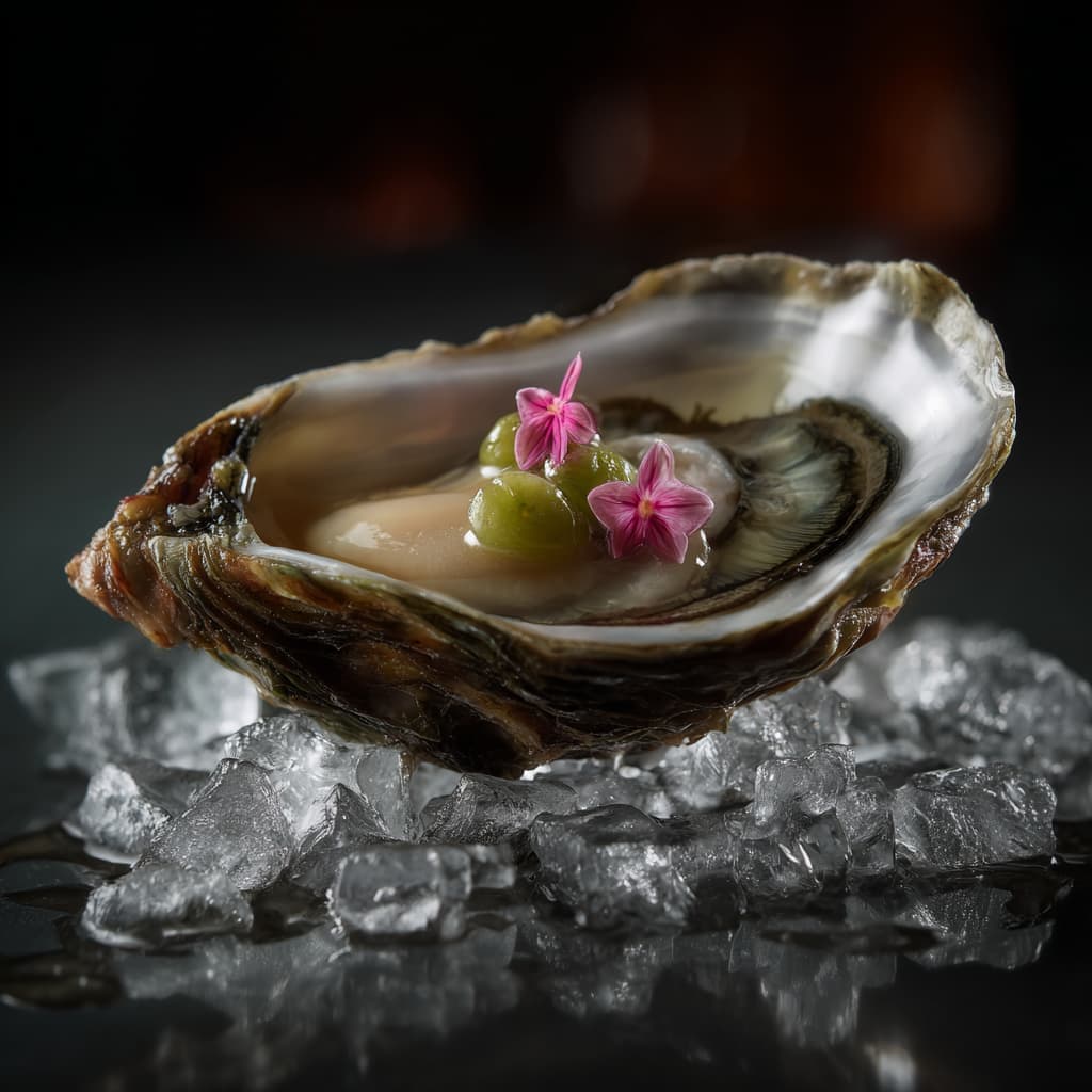 These oysters with a light, Japanese-inspired dressing are fresh, elegant, and full of umami. The combination of ponzu, lime, and mirin provides just the right tang, while cucumber, persimmon, and edible flower petals add color and refinement. A perfect party starter — pure, bright, and surprisingly delicate in flavor. Serve the oysters on crushed ice to keep them ice-cold and extra refreshing.