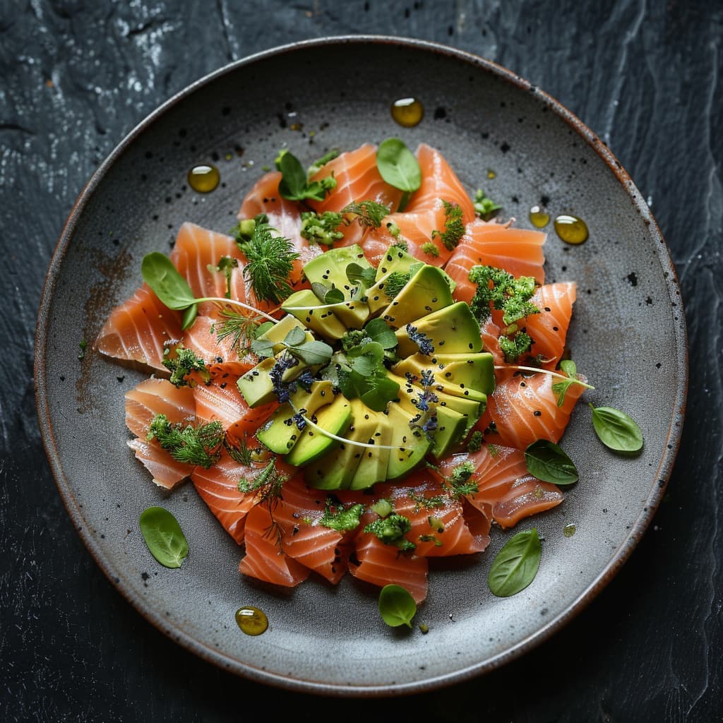 Serve on a shallow white or gray plate, with the salmon-avocado tartare in the center. Finish with salmon roe, fresh herbs, and a small spoon.