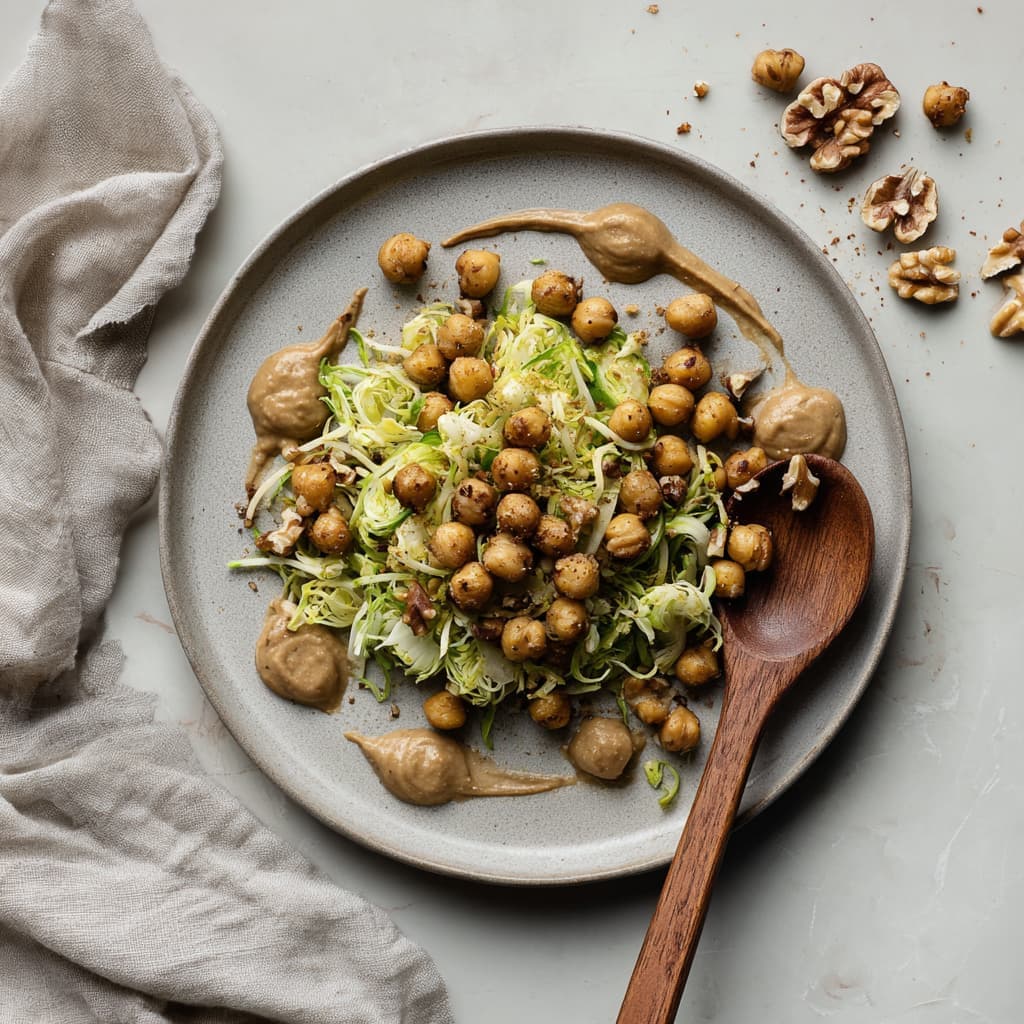 A simple yet powerful metabolic dish: crispy roasted chickpeas, raw finely sliced Brussels sprouts, and a creamy walnut paste full of warm spices. Light, crunchy, and wonderfully satisfying — perfect for a quick lunch or a nourishing dinner. Serve immediately to keep the Brussels sprouts fresh and crisp.