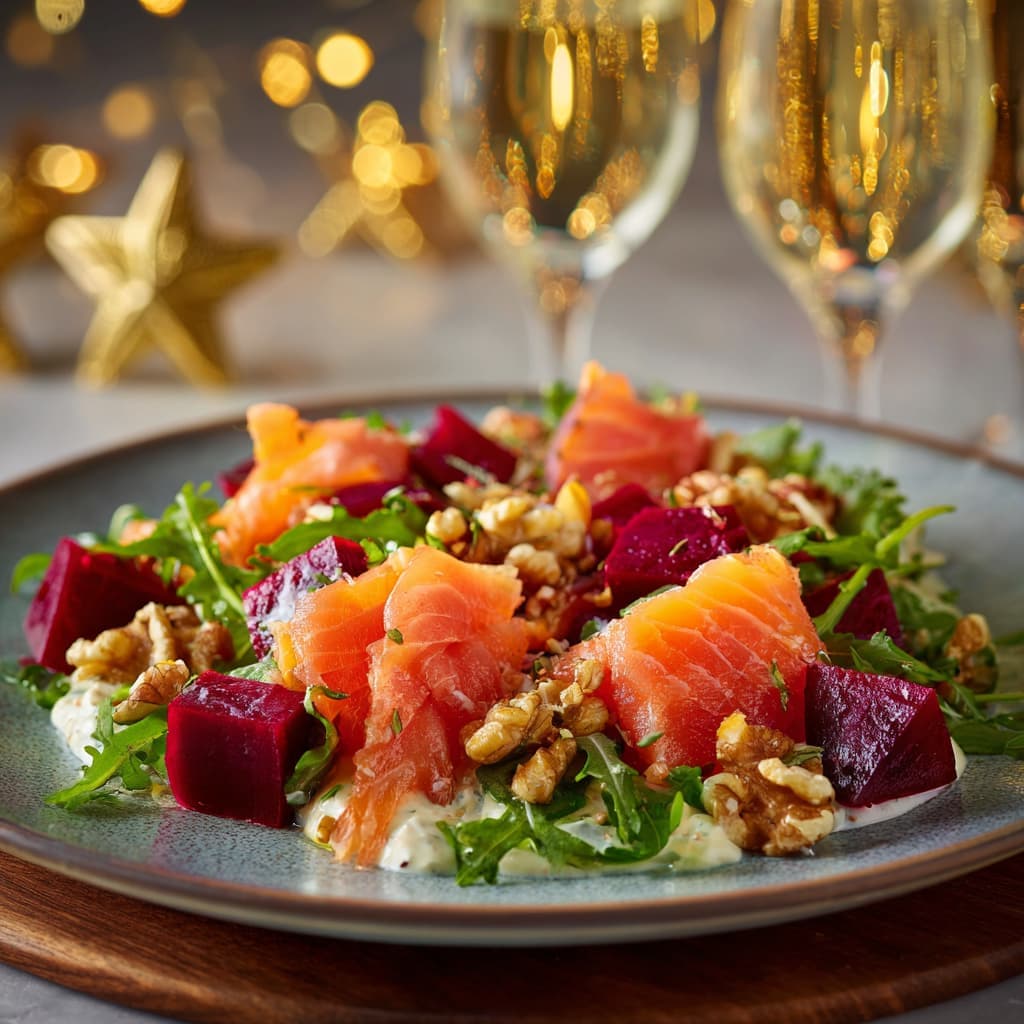 This warm smoked salmon platter is exactly the kind of dish that makes a New Year's Eve table shine: colorful, fresh, and luxurious without being complicated. The combination of tender salmon, sweet beetroot, arugula, and crunchy walnuts makes it a light yet festive starter — perfect for ending the year in style. Break the warm smoked salmon into pieces.