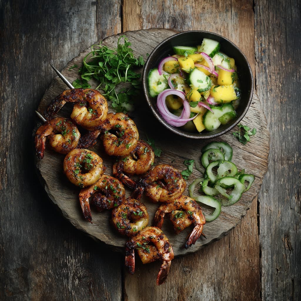Summery, light, and full of flavor. These juicy shrimp skewers are perfectly complemented by a bright salsa with mango, cucumber, and lime. Serve the shrimp skewers warm with the fresh salsa on the side for a light and summery appetizer.