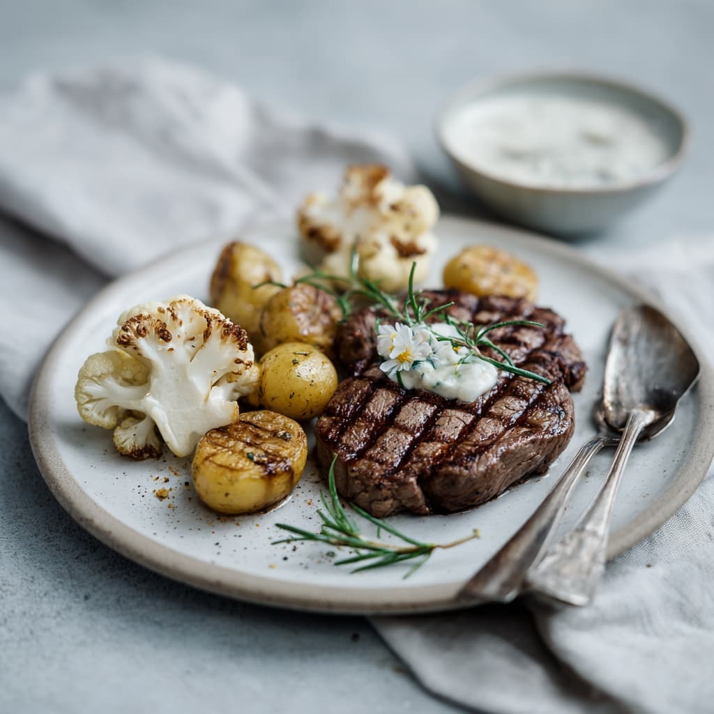 A light, balanced meal combining juicy steak with roasted cauliflower, tender baby potatoes, and a refreshing yogurt-tarragon sauce. Comfort food with a fresh and refined twist. Serve this dish immediately after cooking to keep the steak juicy and the sauce vibrant.