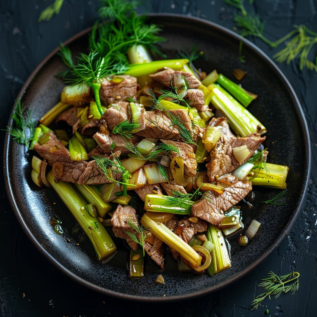 Delicious with a few drops of lemon juice or a spoonful of mustard dressing from the sauces chapter. Serve on a dark plate to highlight the light colors of the chicory and leek. Arrange the veal strips on top and garnish with a bit of fresh parsley or dill.