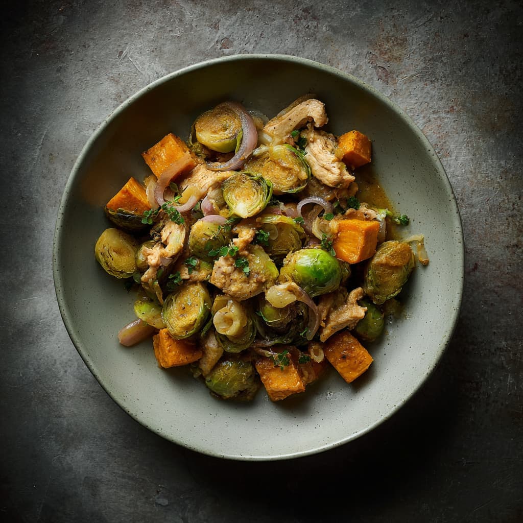 A nutritious, warm meal with soft sweet potato, slightly bitter Brussels sprouts, and savory smoked chicken. Simple, filling, and pleasantly balanced. Serve this dish straight from the pan for a cozy, satisfying home-cooked meal.