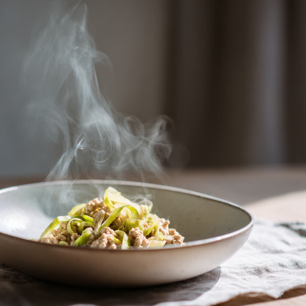 Serve the chicken mince and leek casserole in a deep bowl, adding a small spoonful of cold yogurt on the sideβnot mixed in, but next to it, so warm and cool alternate with each bite. Garnish with some loose leek rings for crunch and a few drops of lemon around the edge of the plate for a fresh aroma. A small handful of fresh herbs (parsley, dill, or chives) completes the dish.