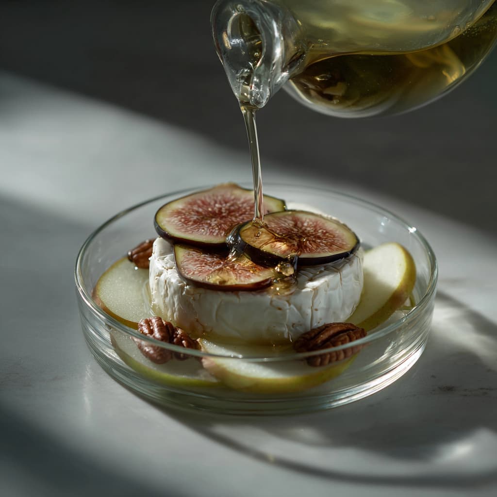 Drizzle a thin stream of honey visibly over the cheese.