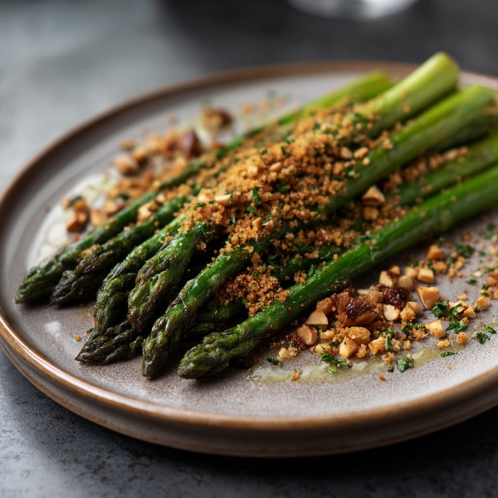 Eenvoudig, elegant en vol textuur. Zacht gegrilde asperges krijgen extra karakter door een warme, krokante topping die het gerecht net dat beetje spanning geeft. Serveer dit gerecht direct na het grillen, zodat het contrast tussen zacht en krokant optimaal blijft.