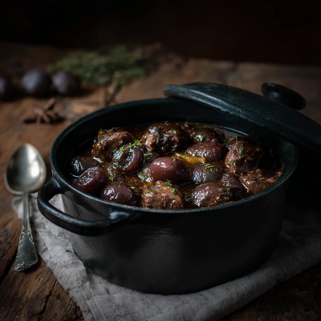 Serveer de lamsbout in diepe kommen zodat de rijke saus en de zachte pruimen mooi uitkomen. Diep, zacht en aromatisch — een stoofgerecht dat meteen warmte geeft.