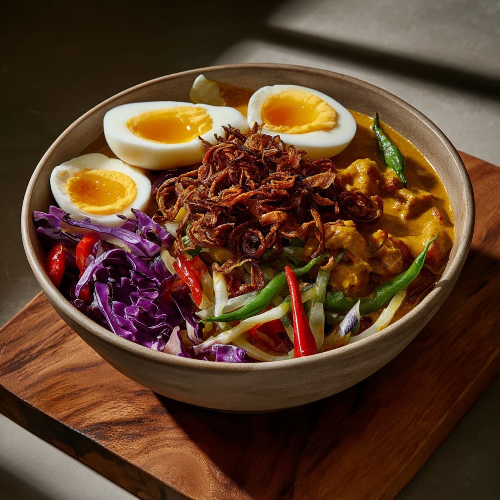 Warm, kruidig en troostend. Deze groentebowl combineert zachte kokos, geurige specerijen en een pittig sambal-ei tot een uitgebalanceerd gerecht dat licht eet maar rijk smaakt. Serveer deze bowl warm en diep uit een kom, zodat de saus en groenten mooi samenkomen.