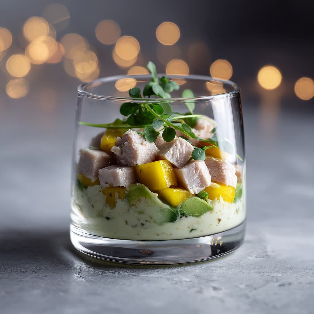 Deze kipcocktail is licht, fris en feestelijk — precies wat je zoekt voor een elegant voorgerecht. De combinatie van zachte gerookte kip, romige avocado en zoete mango geeft een mooie balans, terwijl de frisse dressing alles samenbrengt. Het snijwerk is zo gedaan, en daarna staat er in no-time een heerlijk glas op tafel.. Serveer de kipcocktail in feestelijke glazen voor een frisse en elegante start van het diner.
