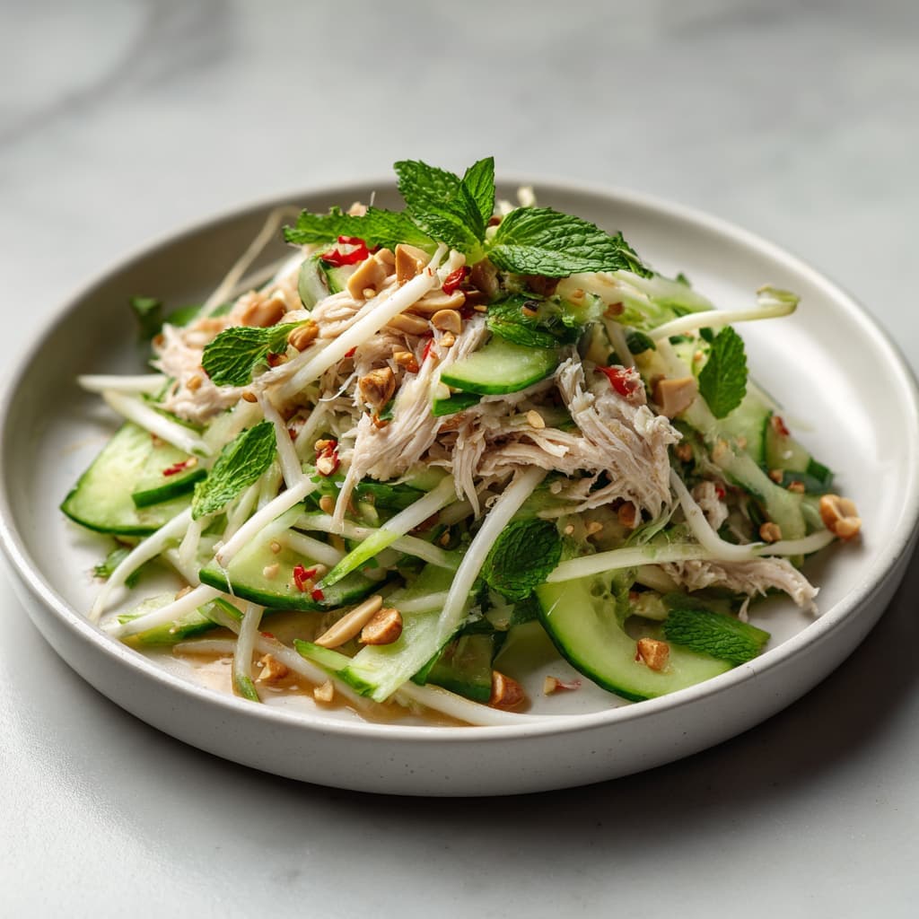 Een frisse, lichte salade met sappige gepocheerde kip, knapperige groenten en een uitgesproken Vietnamese dressing. Aromatisch, levendig en perfect als lunch of verfijnd voorgerecht. Serveer deze salade direct na het mengen zodat de smaken fris blijven en de texturen mooi contrasteren.