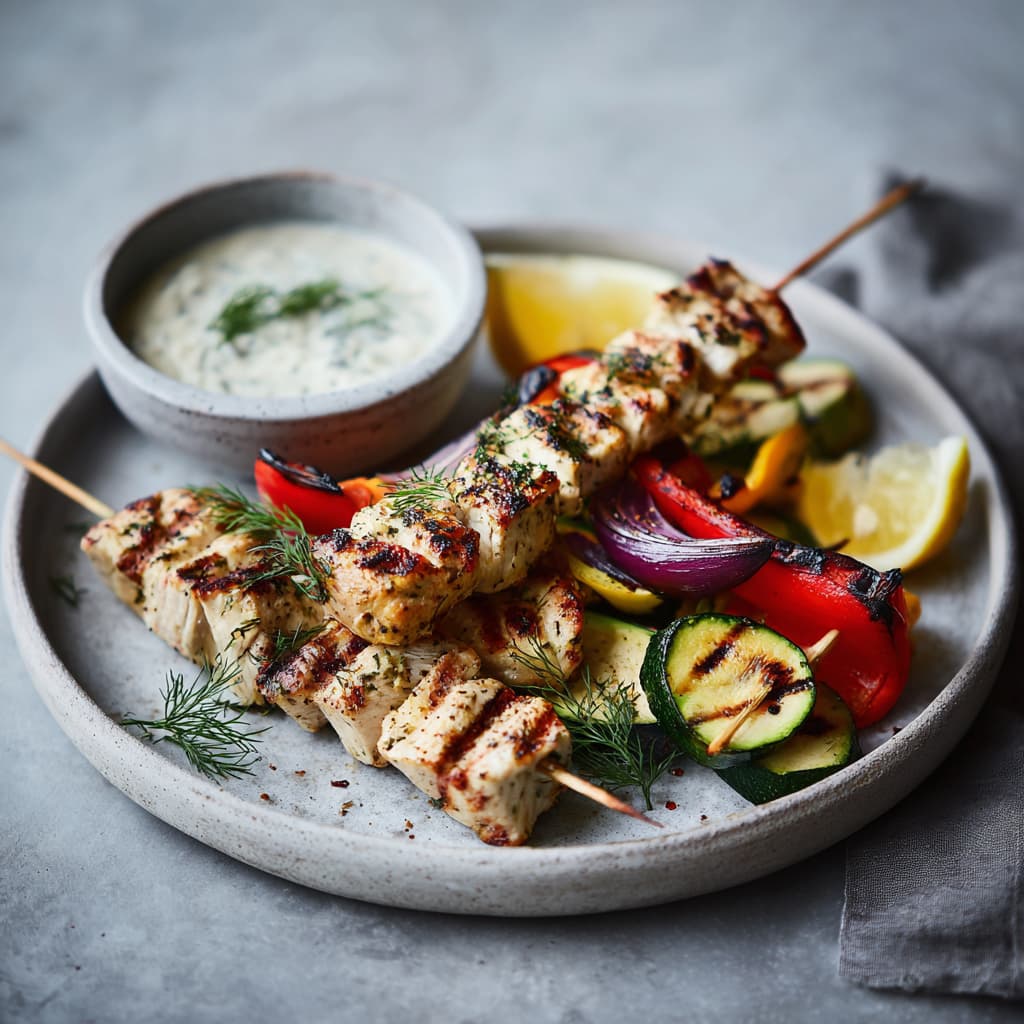Serveer de spiesen warm op een ruime schaal met de groenten eromheen en geef de frisse saus apart voor een lichte, uitgebalanceerde maaltijd.