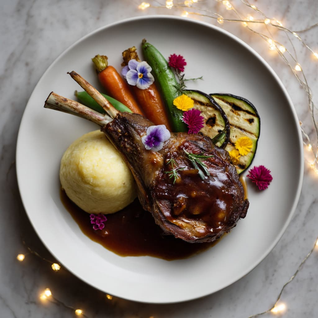Deze feestelijke lamschenkel is zacht, rijk en diep van smaak, geserveerd met een fluweelzachte aardappelpuree en verfijnde gegrilde groenten. De glanzende demi-glace en eetbare bloemen maken het geheel warm, elegant en perfect voor een kerstavond waarop alles iets meer mag schitteren.. Serveer op een ruim wit bord en voeg vlak voor serveren eetbare bloemen toe voor een verfijnde kerstsfeer.