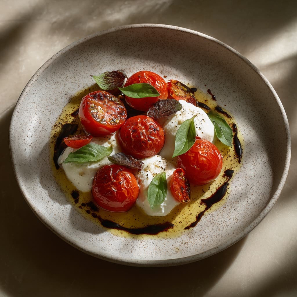 Warme, zoet geroosterde tomaten met romige burrata: een combinatie die bijna niet eenvoudiger kan, maar wel ongelofelijk veel smaak geeft. De honing en balsamico maken het zacht, rond en zomers — precies zo’n gerecht dat je op tafel zet en waar iedereen meteen naar grijpt. Serveer lauwwarm zodat de burrata zacht wordt en de tomaten hun volle smaak afgeven.