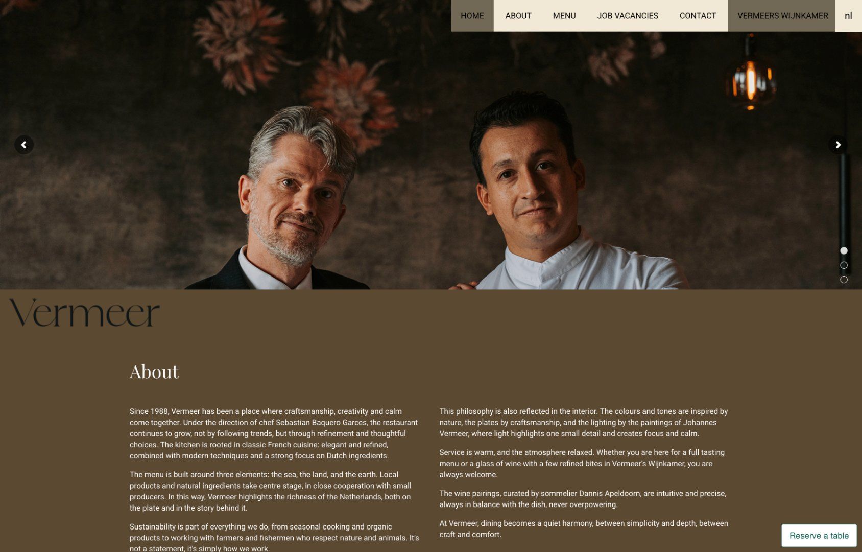“Bij Restaurant Vermeer in Amsterdam ervaart u een intieme sfeer in een prachtig designrestaurant. Gevestigd in het NH Collection Amsterdam Barbizon Palace, biedt Vermeer een eigentijdse Franse keuken onder leiding van chef Sebastian Baquero Garces. De gerechten zijn creatief en gedetailleerd, met een focus op farm-to-table ingrediënten. Of u nu kiest voor het menu of à la carte, elke maaltijd is een culinaire belevenis.”