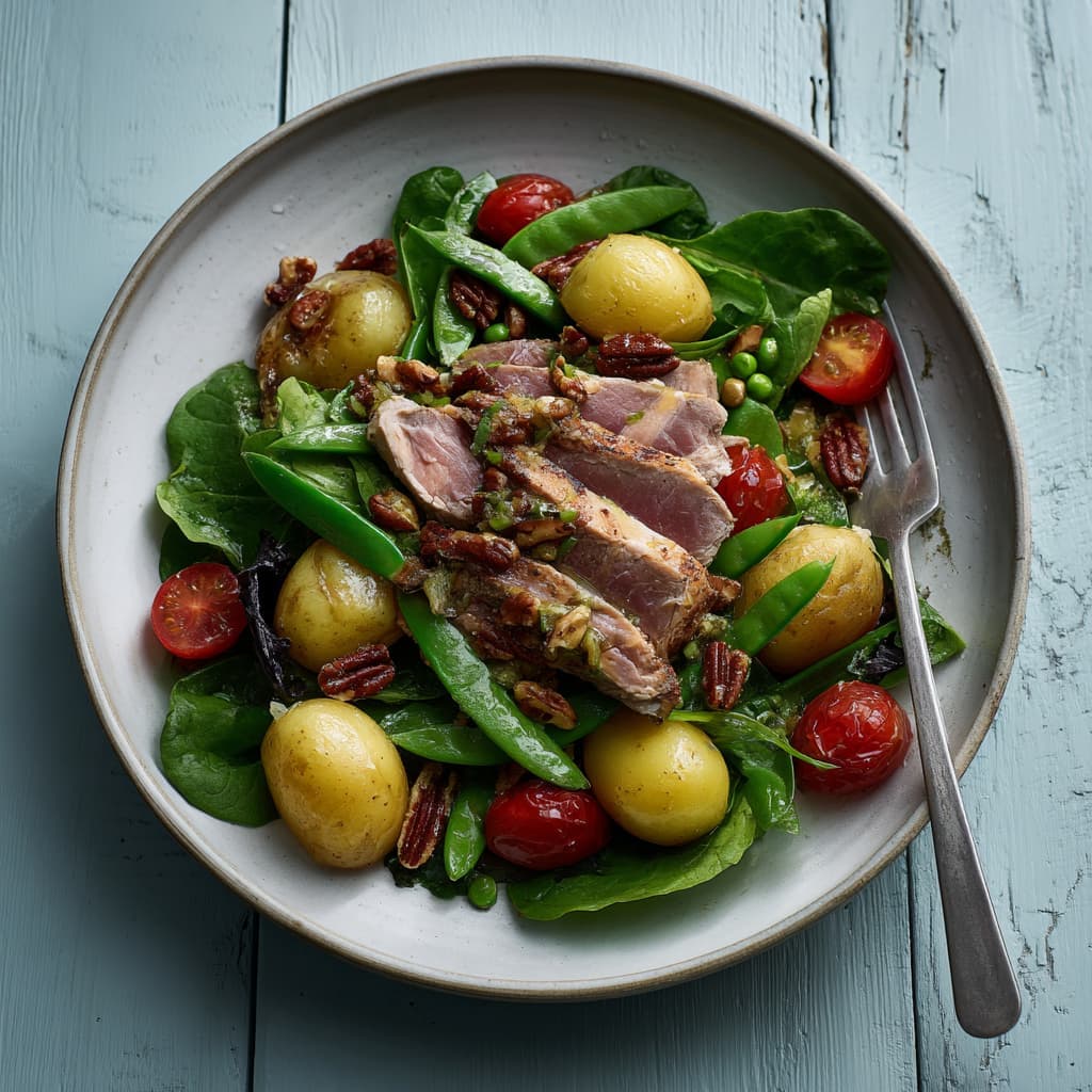 Deze salade is royaal en in balans, met stevig gegrilde tonijn, knapperige groenten en zachte aardappeltjes. Fris, vullend en precies geschikt als lichte maar complete maaltijd. Serveer de salade terwijl de tonijn nog lauwwarm is, dat geeft het gerecht extra diepte.