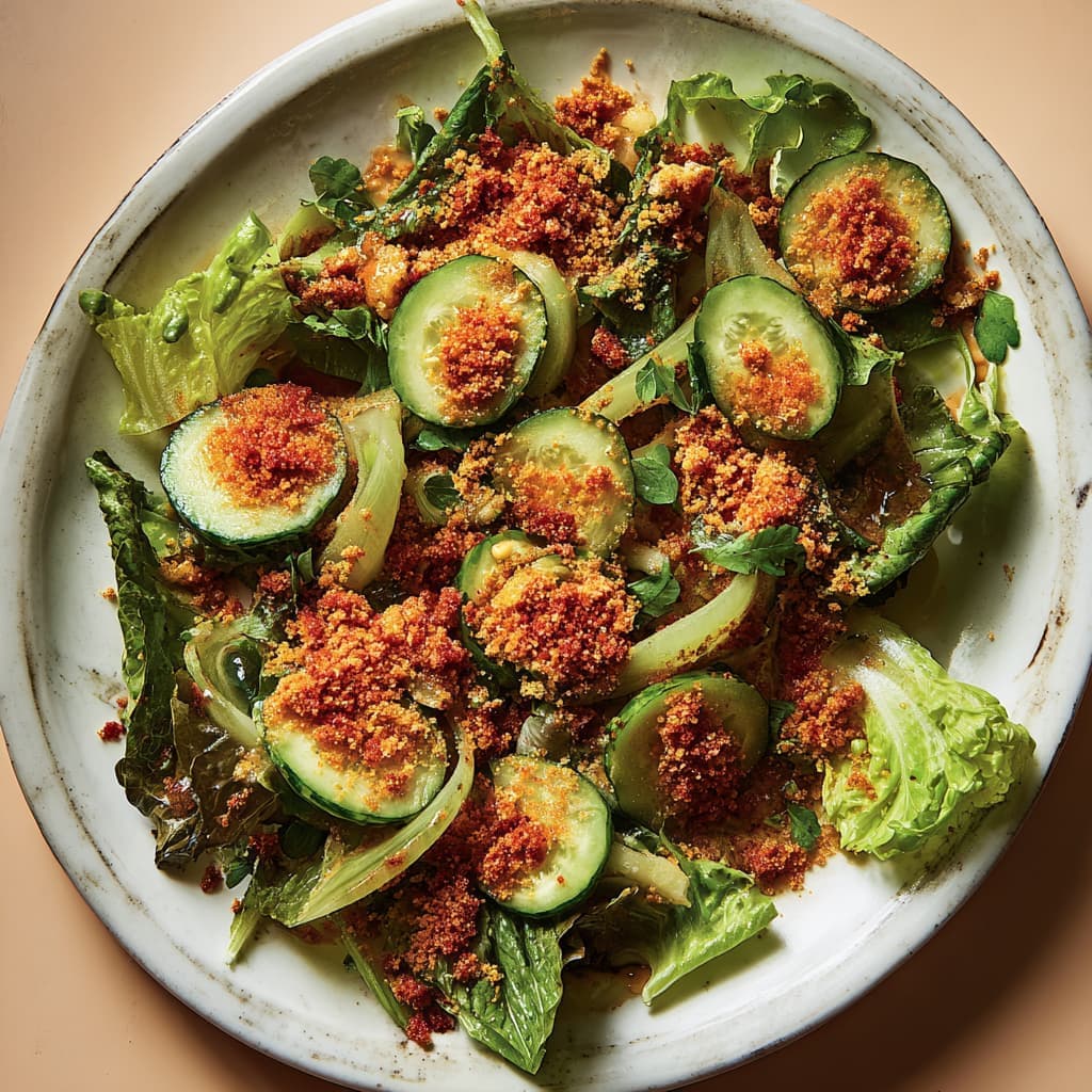 Spicy winter salad met komkommer en pittige broodkruimels