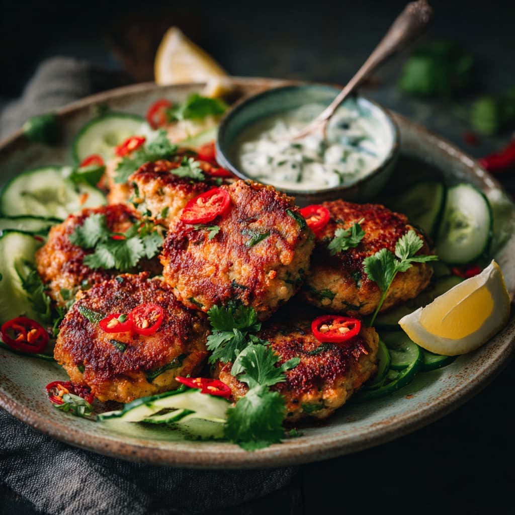 Licht, fris, aromatisch, geen suiker, geen frituur — pan gebakken, clean en modern. Leg de koekjes op een blad romanasla met een paar dunne plakjes komkommer voor een frisse, Thaise stijl.