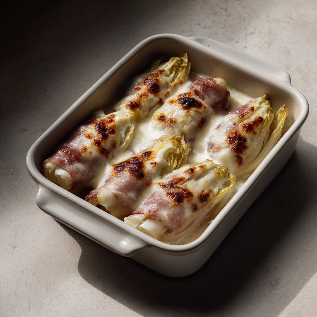 Een klassieker in een zachte, evenwichtige uitvoering. Het licht bittere witloof combineert mooi met hartige ham en een romige maar verfijnde kaassaus. Dit gerecht serveer je warm en rustig, heerlijk in combinatie met een zachte aardappelpuree.