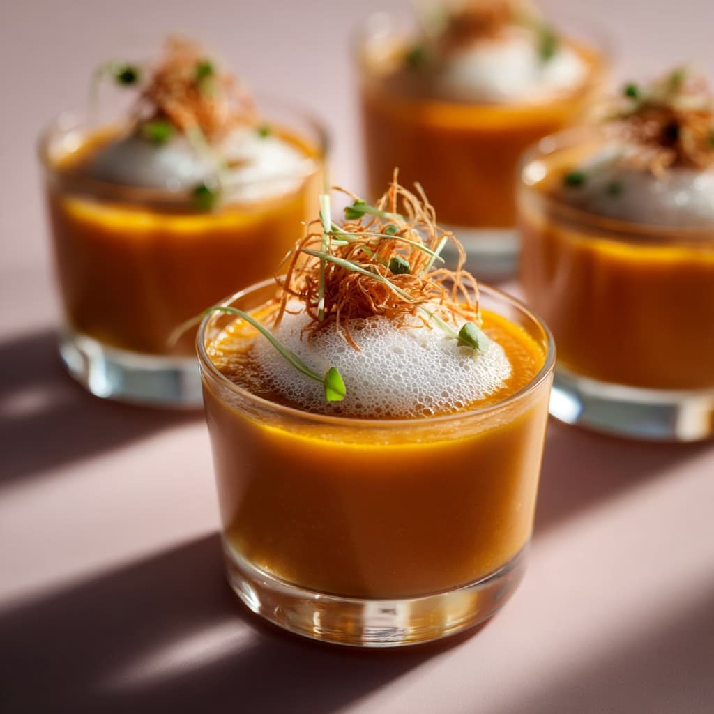 Zachtzoete wortel, warme kerrie en fris limoensap komen samen in een elegante soep die licht en verzorgd aanvoelt. Het kokosschuim maakt het geheel rond en geeft een subtiele romigheid. Deze soep komt het mooist tot zijn recht in kleine glaasjes, als verfijnde lunch of elegant voorgerecht.