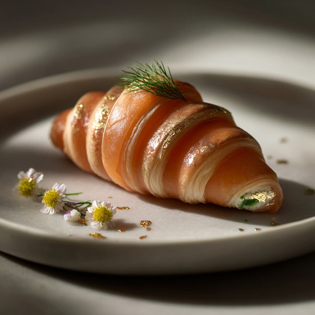 Deze zalmrol in croissantvorm is een elegant gerecht waarin zachte kaas, verse spinazie en dille samenkomen in een verfijnde vulling. De zalm wordt strak opgerold tot een sierlijke croissant, waardoor het geheel zowel luxe als speels oogt. Een prachtig voorgerecht of feestelijke amuse die meteen indruk maakt. Serveer op een ruim bord met frisse kruiden of een drupje citroen voor elegantie en balans.