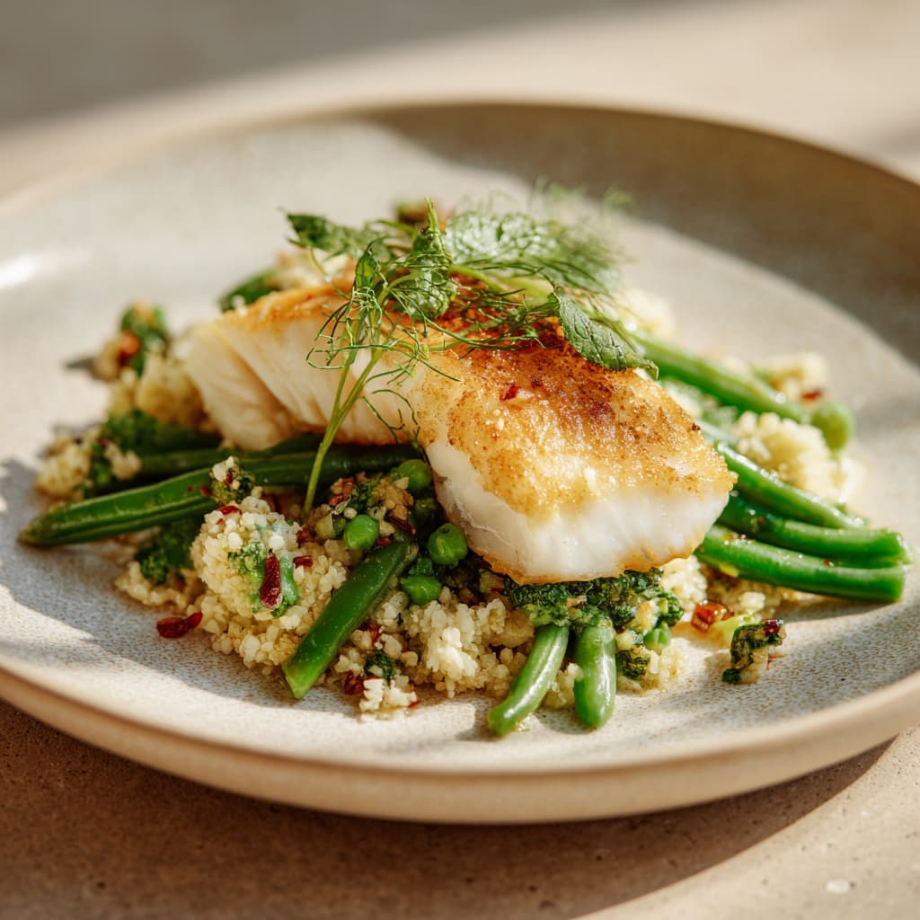 Serveer op een licht bord met de vis bovenop de groentemix. Werk af met wat verse dille en een dun schijfje citroen.